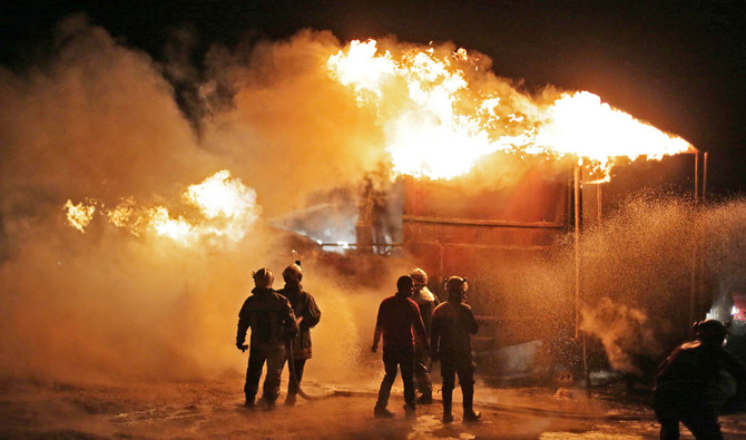 Rescue workers spent hours trying to extinguish the fire which spread to about 180 oil tankers.