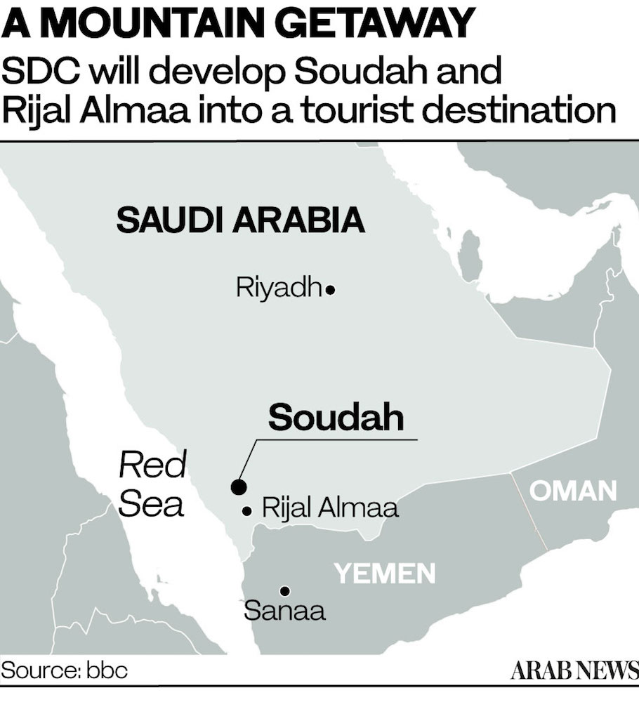 The Soudah Development Company (SDC) was launched at the end of February by Crown Prince Mohammed bin Salman, chairman of the Public Investment Fund (PIF), to help Soudah and parts of Rijal Almaa in the Asir region grow into a world-class tourist destination.