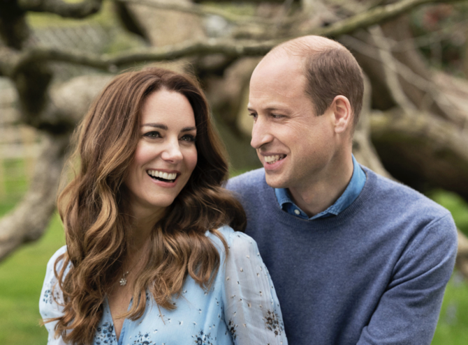Two photographs show Prince William, second-in-line to the throne, and the former Kate Middleton in complementary shades of blue. A video released later showed the family at play, replete with their smiling children walking near the sea.