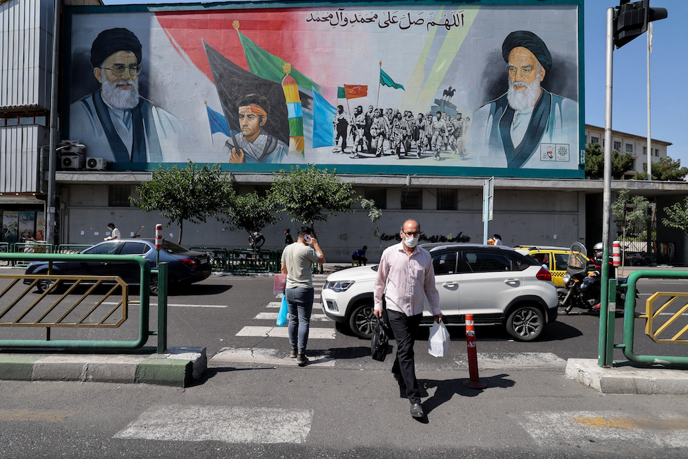 People, mask-clad due to the COVID-19 coronavirus pandemic, walk beneath a billboard depicting the Islamic Republic founder Ayatollah Ruhollah Khomeini (R) and Supreme Leader Ayatollah Ali Khamenei (L) at Enghelab Square in the centre of Iran's capital Tehran on May 16, 2021. (AFP)