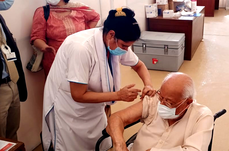 100-year-old Israil Ahmed Menai, receives first dose of coronavirus vaccine in Karachi, Pakistan on March 12, 2021. (AN Photo)