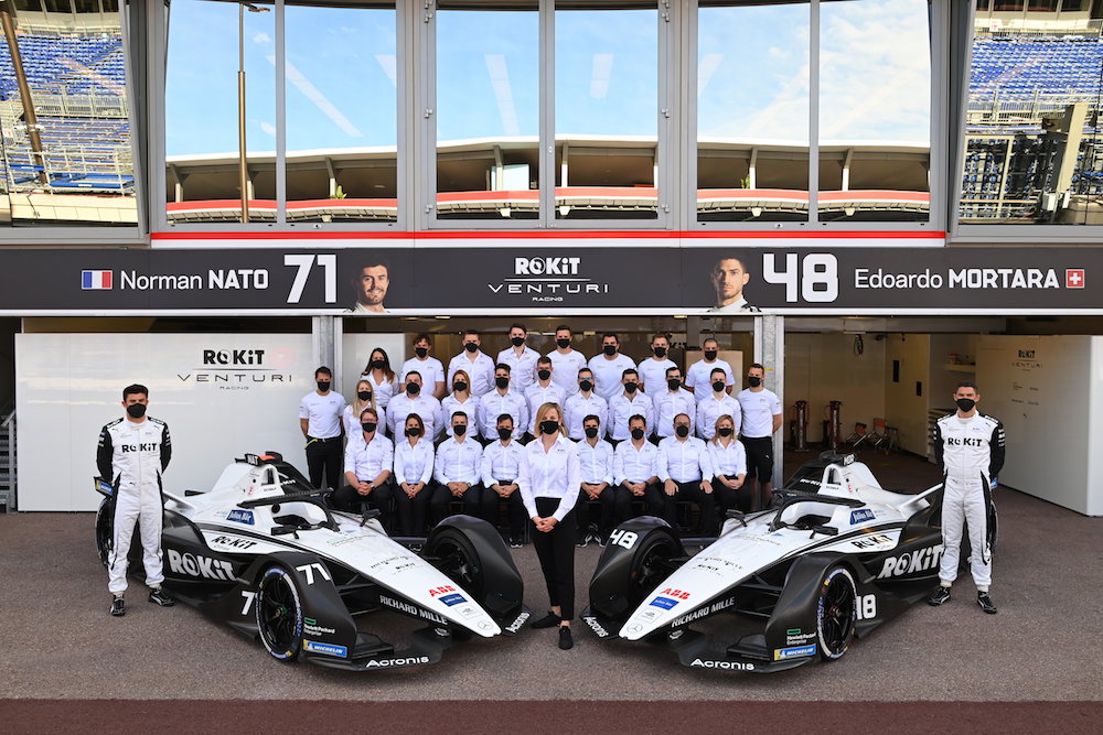 Susie Wolff, ROKiT Venturi Racing Team Principal, with the whole team as Season 8 calendar is announced. (Supplied/ROKiT Venturi Racing)