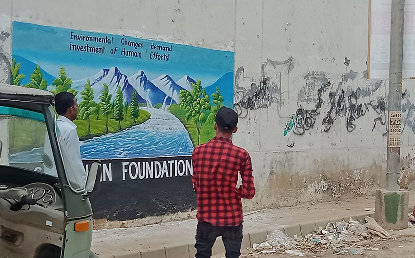 Tariq Khan, a director of the Sadequain Foundation, said Sanam’s mural was part of an initiative to paint bus stops, flyovers and education institutions with colorful artwork that would create awareness and lead people to reflect on the perils of climate change.