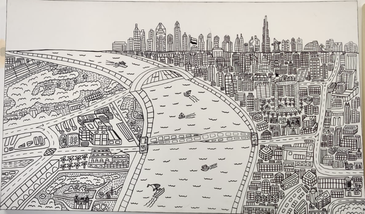 “Abdulla’s distinct black-and-white drawings of the UAE skylines and landscape usually feature an exaggerated humorous glimpse of everyday Emirati life,” it continues. This 2019 work captures one of Dubai’s older landmarks — the creek that made it a trade hub long before the discovery of oil in the Emirates. Lutfi works from Tashkeel’s “Next Chapter” studio in the city’s creekside Al-Fahidi neighborhood — a space he shares with artists including Asma Baker, who is also on the autism spectrum.