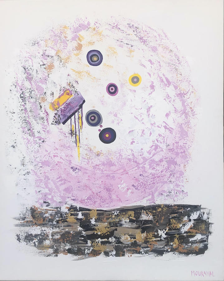 Lebanese artist Rima Moukahal spent much of her life in the corporate world, before deciding “to return to her passion” having given up her dream of becoming an artist when the Lebanese civil war began in 1975, shortly after she had won a trip to Italy to study drawing. Now, she is once again honing her artistic skills with abstract expressionist works such as “Truth Underneath,” which she explains “shows the cycle of a woman’s life.” “Filled with … determination, her accomplishments shine bright. Yet … below the sheen of success sits a hidden truth of sadness and silent suffering.”