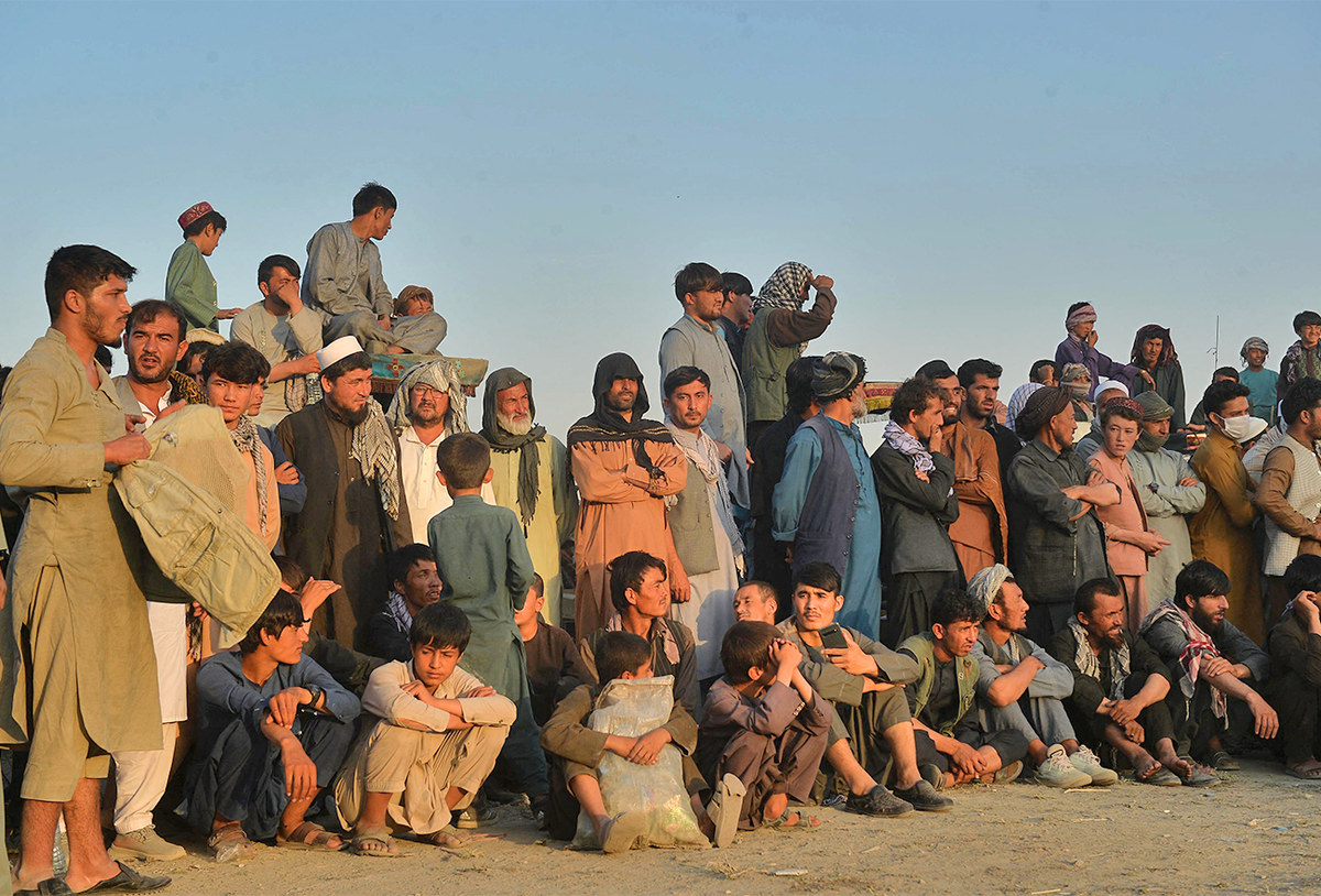 People gathering around to watch fighters from around Afghanistan performing their judo and wrestling skills in Chaman-e-Huzuri park, downtown Kabul, Afghanistan, on September 24, 2021. (AFP)