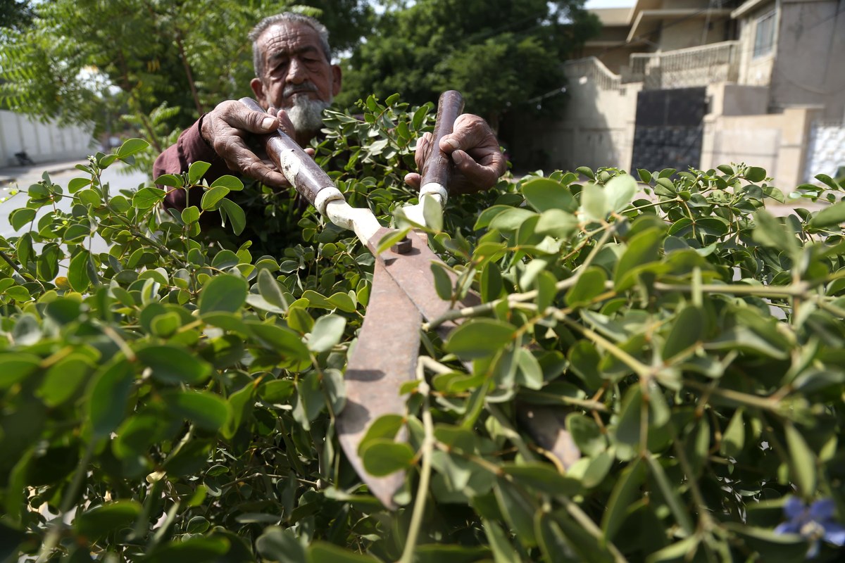 69-year-old gardener Sabir Gul prunes a plant in Karachi, Pakistan, on October 26, 2021. (AN Photo)