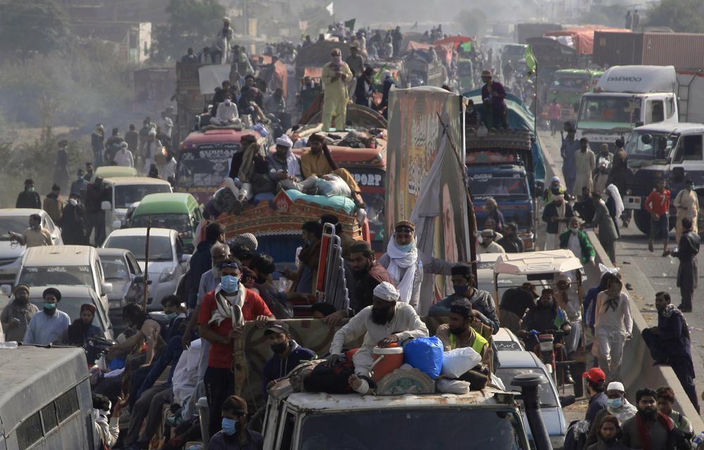 Supporters of Tehreek-e-Labiak Pakistan, a radical Islamist party, take part in a protest march toward Islamabad, on a highway in the town of Sadhuke, in eastern Pakistan, Wednesday, Oct. 27, 2021. (AP)