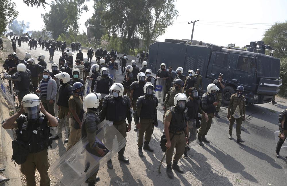 Police officers with riot gear try to stop supporters of Tehreek-e-Labiak Pakistan, a radical Islamist party, during a protest march toward Islamabad, on a highway in the town of Sadhuke, in eastern Pakistan, Wednesday, Oct. 27, 2021. (AP)