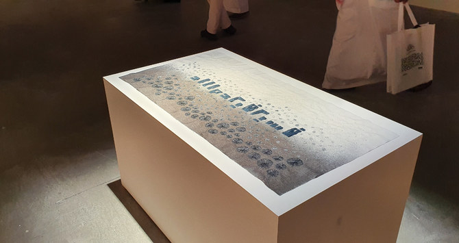 Artist Hind Alghamdi carved a wooden wheel-shaped sculpture decorated in Kufic script with the Quranic verse, “Guide us to the straight path,” and was inspired by driving around the Kingdom. “I chose this verse because humans will always be searching for the right path,” Alghamdi said. “This was my first time using this medium and my first time using Kufic script.”