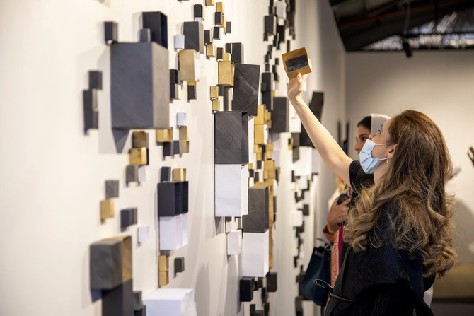 Saudi artist Ahaad Al Alamoudi displays her artwork at the exhibition.