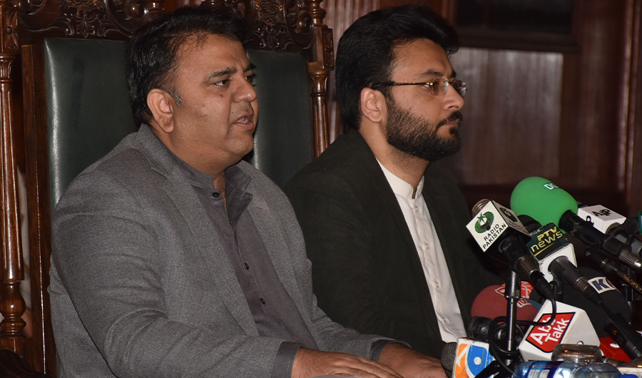 Pakistan's Federal Minister for Information and Broadcasting Chaudhry Fawad Hussain (L) talking to media in Lahore on Dec 12, 2021. (PID)