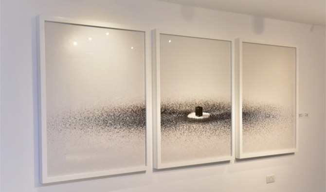 It features seminal works by the artist, originally a physician from Abha in the southern part of the country, made over the past several decades, notably from his “Evolution of Man” series (2010), presenting X-rays that mutate from a petrol pump into a skeleton and then to a man holding a gun to his head, exploring the environmental and social risks of oil and its ability to spiral into destruction. There is also a work from his “Magnetism” series (2009), showcasing a crisp black and white miniature diagram of the Kaaba in Makkah.