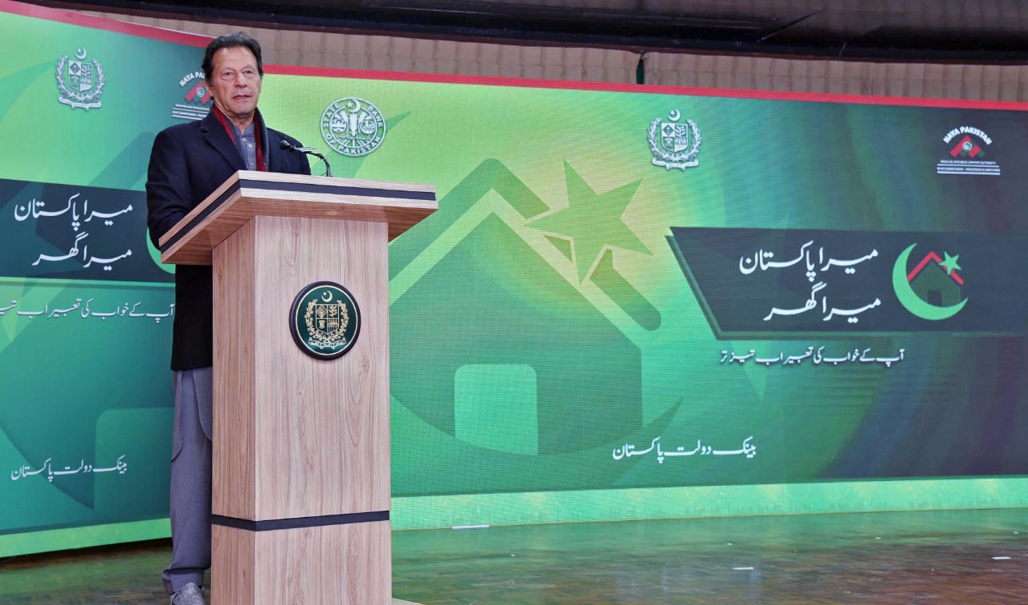 Pakistan Prime Minister Imran Khan addressing the Mera Pakistan Mera Ghar ceremony in Islamabad on December 24, 2021. (PID)