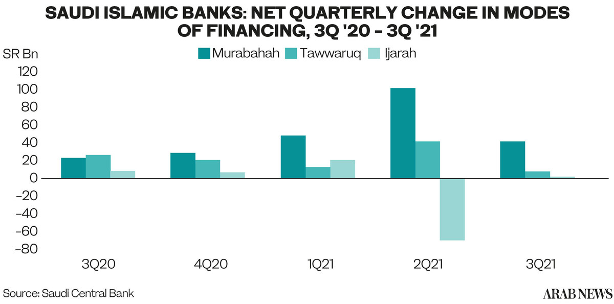 Most noticeable is the slowdown in Ijarah financing as the total value of this mode of the Shariah-compliant financing provided by Saudi Islamic banks at the end of the third quarter fell 18 percent year-on-year. The total value of Ijarah contracts also saw a 16-percent annual fall in the second quarter after the 22-percent increase in the first quarter of 2021.