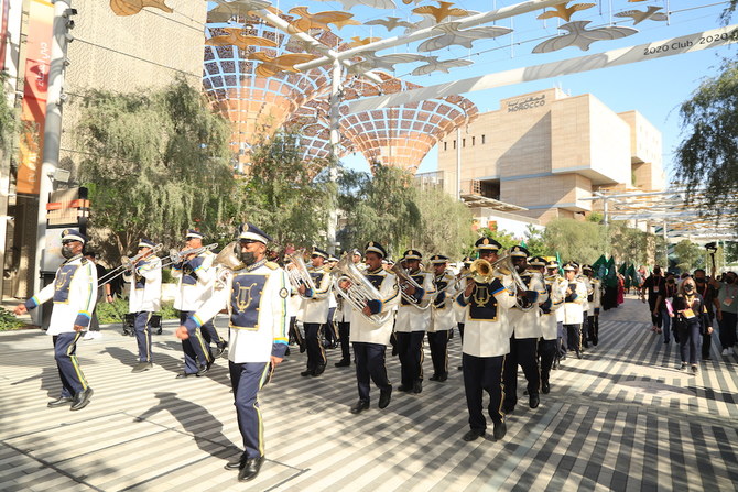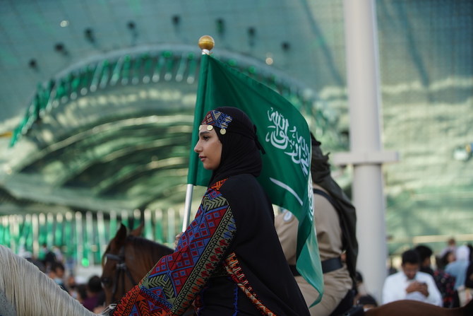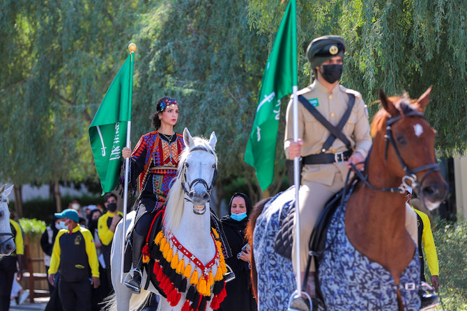 The parade on Al-Ghaf Avenue, in front of the pavilion, was led by 80 members of a military band playing trumpets and drums. It also included women in traditional and contemporary Saudi dress, and men on horseback representing the Kingdom’s rich equestrian traditions.