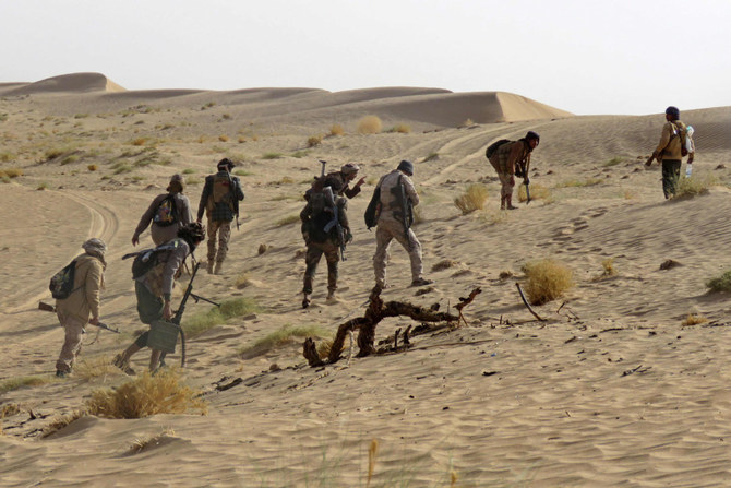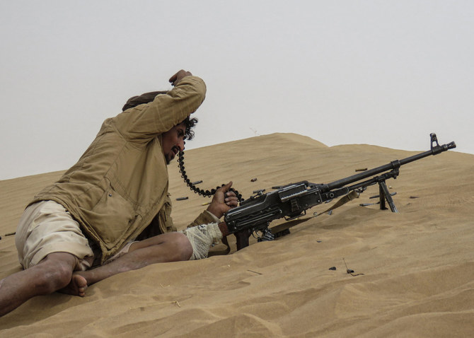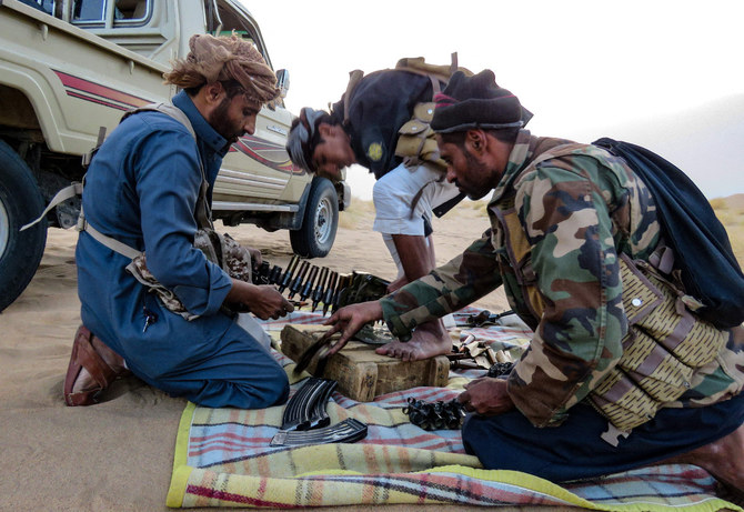Yemeni pro-government fighters load their guns with ammunition during fighting with Houthi rebels on the in the south of the strategic governorate of Marib, on January 5, 2021. (AFP Photo)