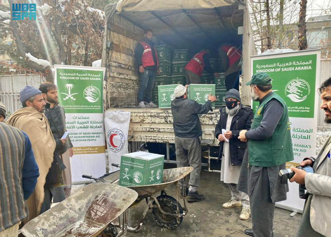 KSrelief teams distributed 600 food baskets with a combined weight of more than 36 tons in Kabul to help 2,100 people. The aid comes as part of the Saudi relief airlift dispatched by the center to support Afghans.
