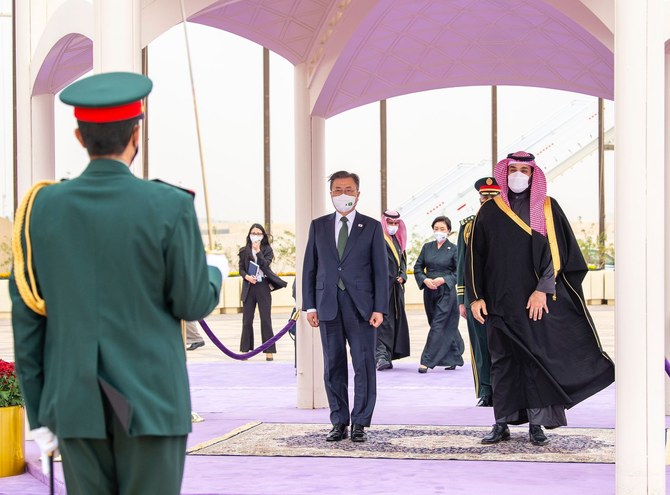 Earlier, the South Korean president and his wife were received by Prince Mohammed on arrival in the Kingdom at King Khalid International Airport.