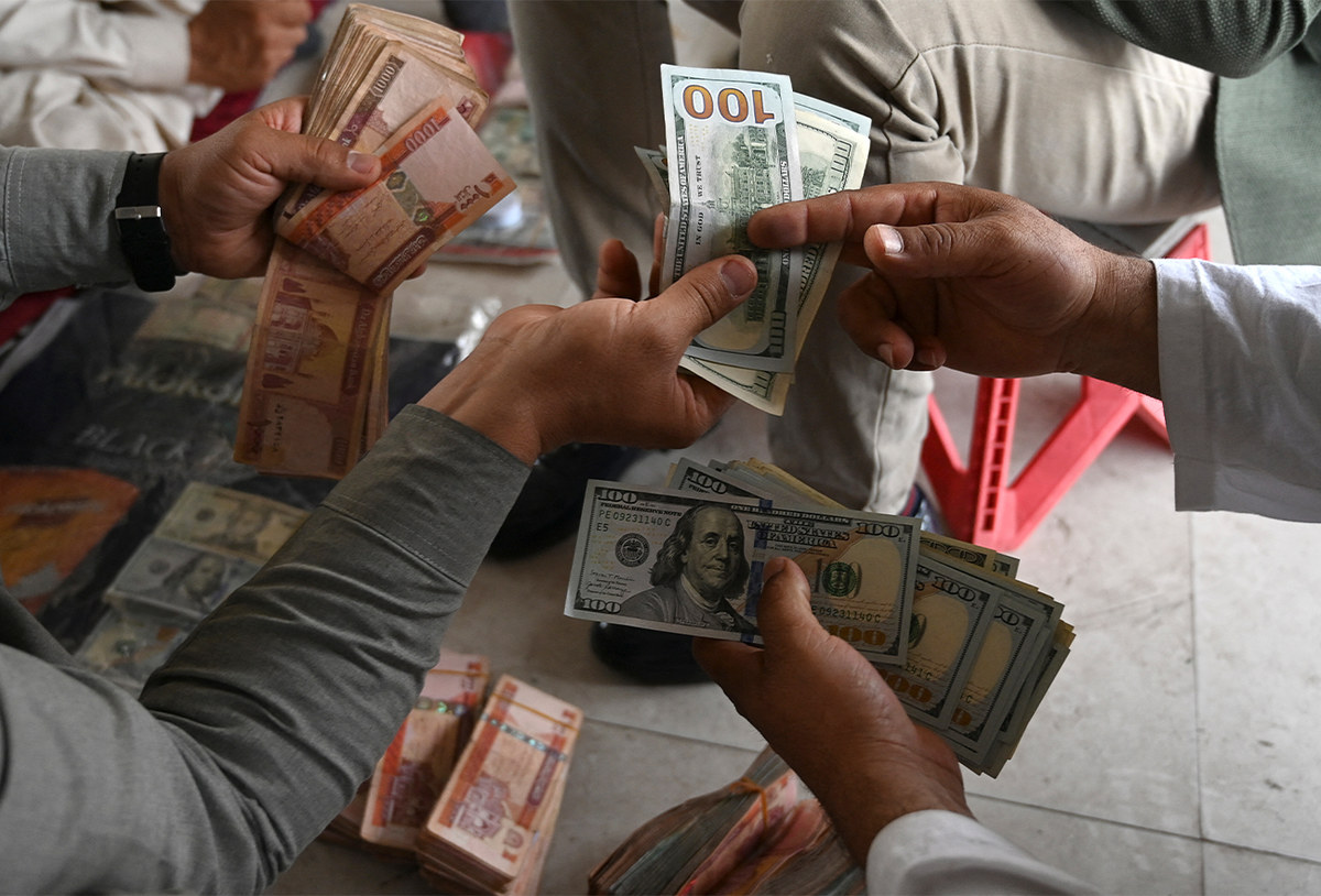 A currency dealer (R) counts US dollars at the Shahzada exchange market in Kabul, Afghanistan, on June 21, 2021. (AFP/File)