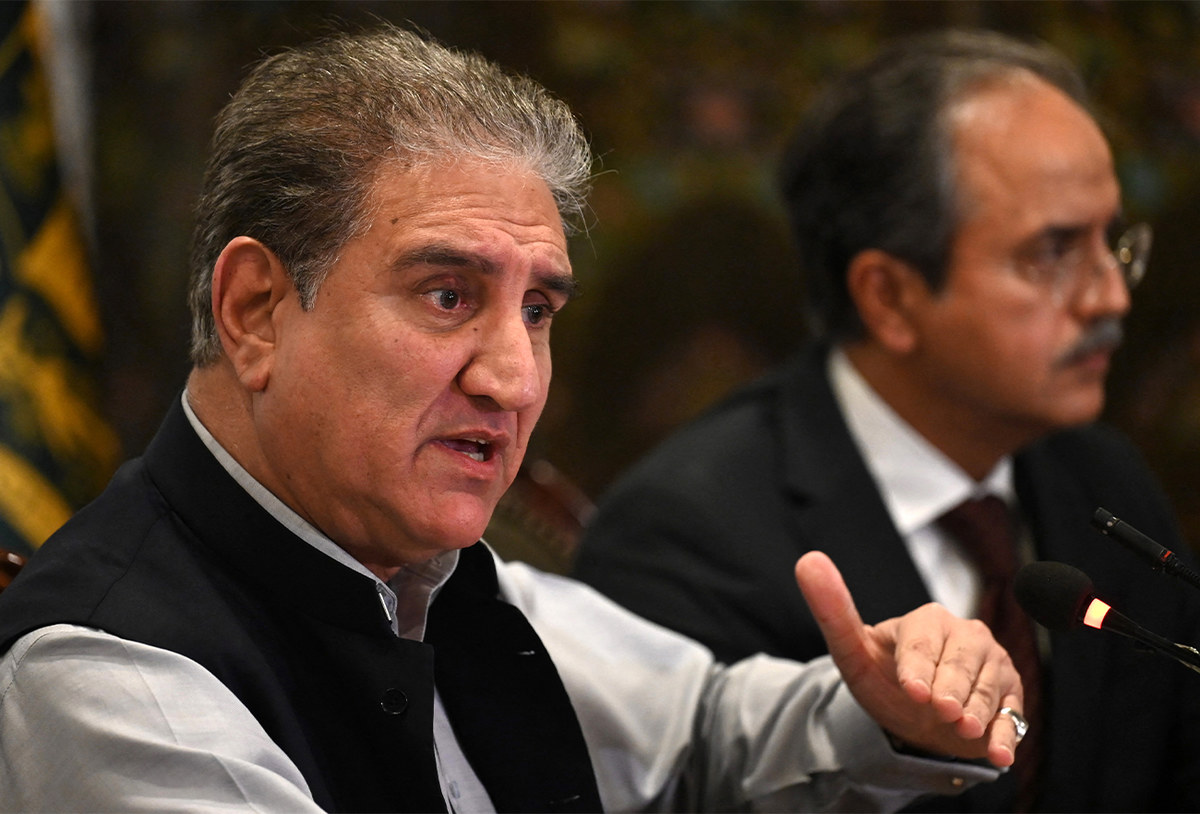 Pakistan's Foreign Minister Shah Mahmood Qureshi (L) speaks during a press conference over the ongoing situation in Afghanistan, at the foreign ministry in Islamabad on August 23, 2021. (AFP/File)