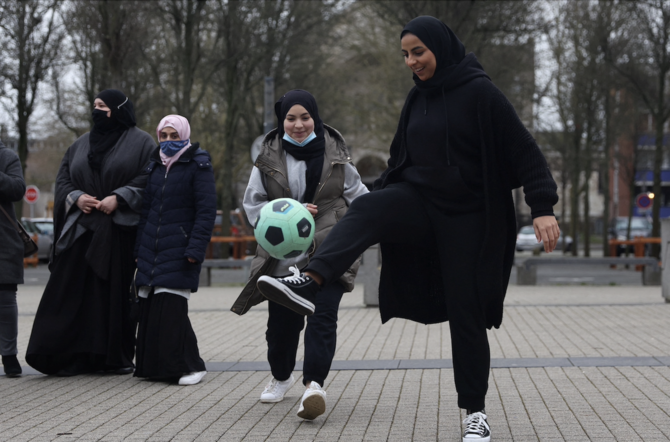 Supporters of the women soccer team “Les Hijabeuses” play soccer in front of the city hall in Lille as part of a protest on February 16, 2022. (Reuters)