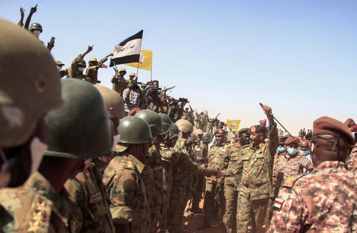 Sudan's top general Abdel Fattah al-Burhan greets soldiers during military exercise in the Maaqil area in the northern Nile River State on Dec. 8, 2021. (Photo by Ebrahim Hamid / AFP)