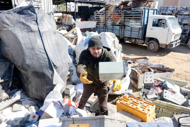 A Palestinian man picks discarded batteries to resell for recycling, at a scrapyard in Khan Yunis in the southern Gaza Strip, on February 14, 2022. (AFP)