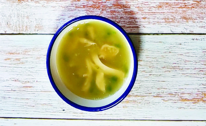 While the broth is simmering be sure to remove any impurities that collect on the surface with a spoon. When the chicken is tender strain the broth and set it aside. Fish out the chicken as well and shred it for later.