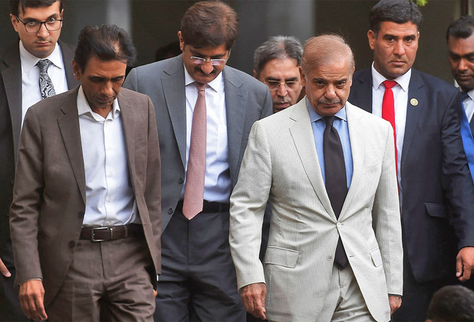 Pakistan's Prime Minister Shehbaz Sharif waves as he arrives to meet leaders of the Muttahida Qaumi Movement (MQM-P) and collation partners of the newly formed government during his visit in Karachi on April 13, 2022. (AFP)