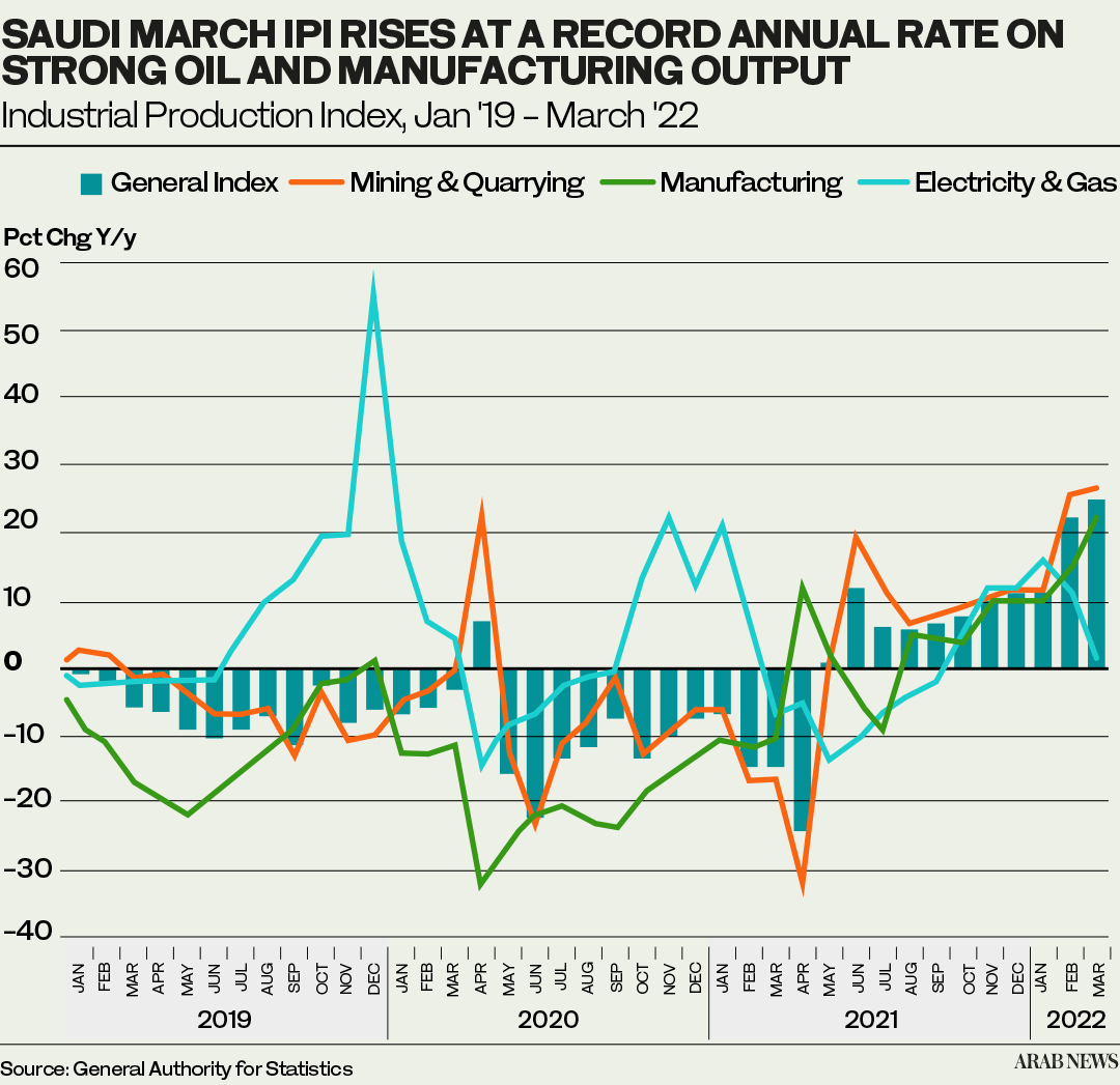 Riyadh: Saudi Arabia's Industrial Production Index, also known as IPI, grew by 24.8 percent in March 2022 compared to the same month of last year.
