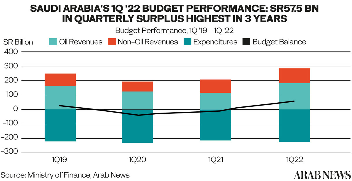 RIYADH: Saudi Arabia recorded its highest quarterly budget surplus in six years during the first quarter of 2022, amounting to SR57.5 billion ($15.3 billion), the Ministry of Finance announced on Sunday.