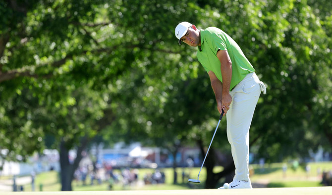 Scheffler teed off on 10 and rolled in a six-foot birdie putt at the 14th and drained a 40-footer at the 17th — where he was in a fairway bunker.
