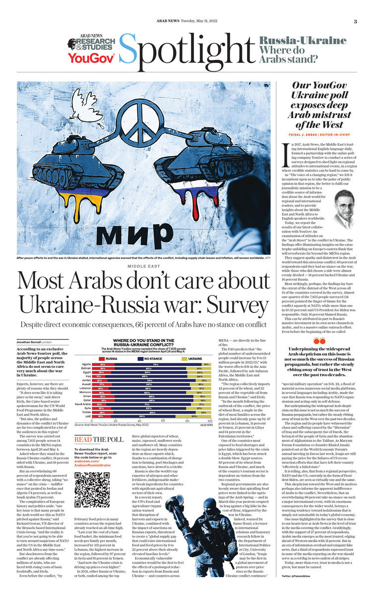 LONDON: According to an exclusive Arab News-YouGov poll, the majority of people across the Middle East and North Africa do not seem to care very much about the war in Ukraine.