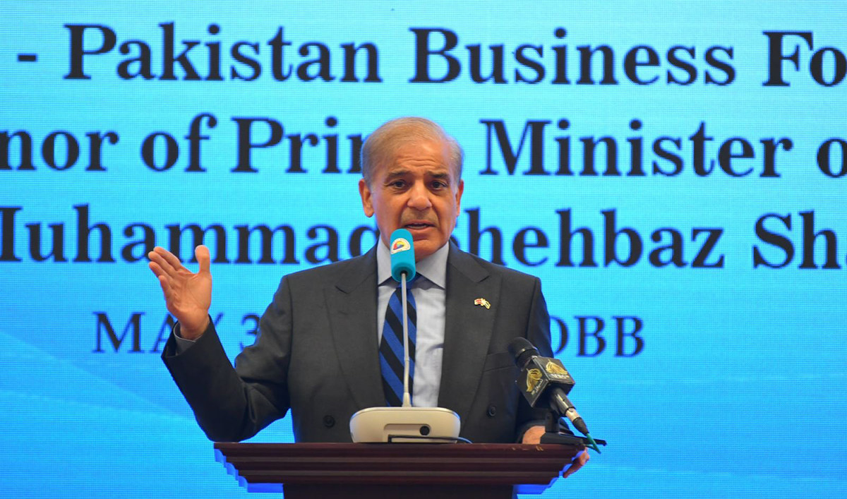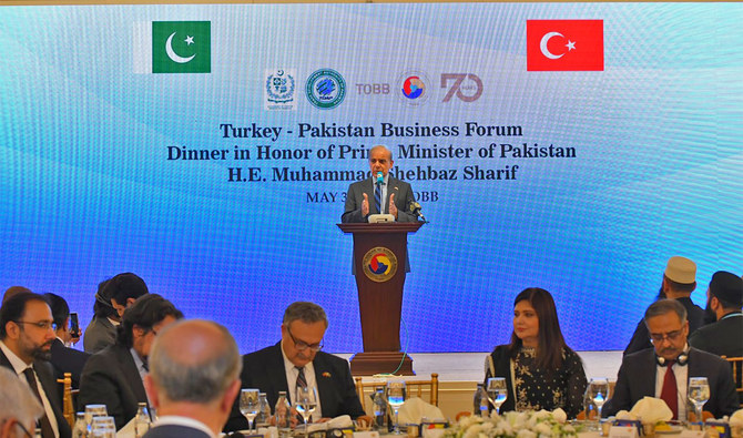 Pakistan premier Shehbaz Sharif addresses the Pakistan-Turkey Business Council Forum in Ankara, Turkey, on May 31, 2022. (PID)
