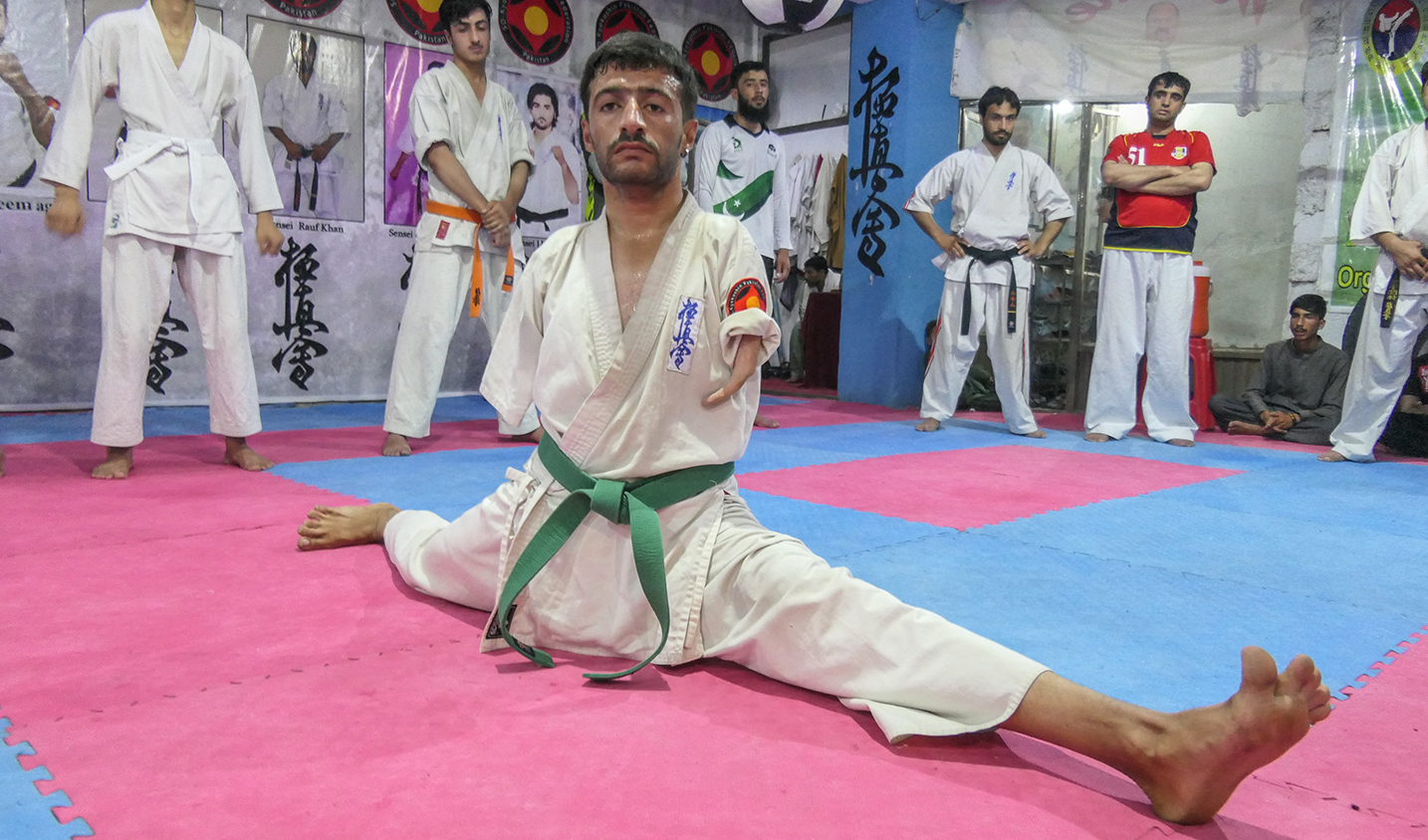 Shoukat Khan, a young martial artist, sat on the floor before taking off his shirt with his feet and getting dressed in his white karate kit and green belt.