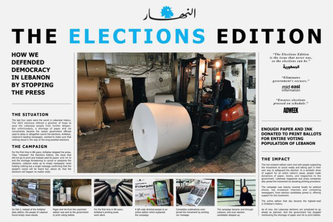 DUBAI: “The Election Edition,” a campaign by Lebanese newspaper An-Nahar and Dubai-based marketing communications group Impact BBDO, was awarded the Grand Prix in the Print and Publishing category at the Cannes Lions International Festival of Creativity this week.