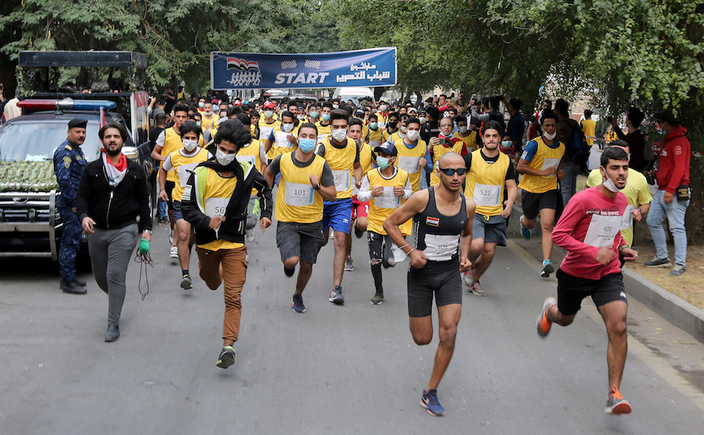 Runners take part in the Tahrir Youth Marathon, in support of ongoing anti-government protests, in the Iraqi capital Baghdad. (AFP)