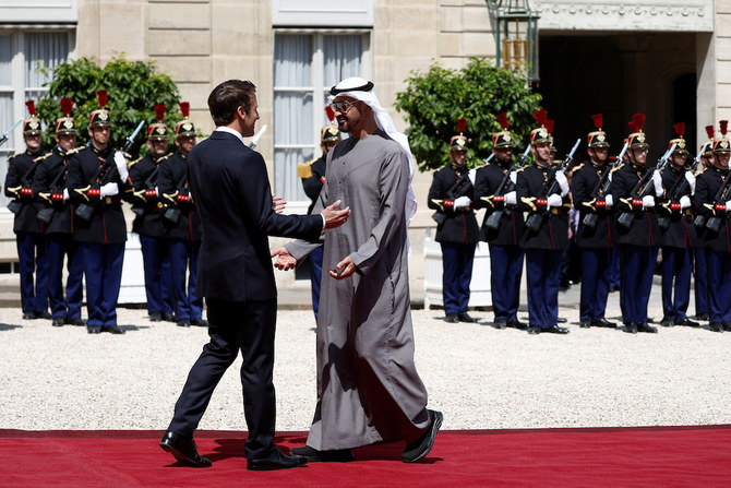 He was received at the Élysée Palace in an official ceremony to meet Macron and discuss joint action in the fields of “future energy, climate change and advanced technology” and efforts to bolster regional security and stability, the state news agency WAM earlier said.