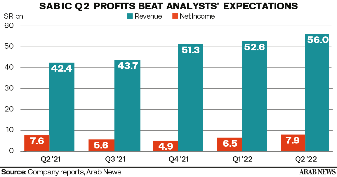 RIYADH: Saudi chemical giant SABIC has reported a surge in second-quarter profits to SR7.93 billion ($2.1 billion), beating analysts’ average estimate of SR5.9 billion.