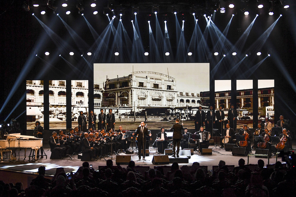A handout picture released by the Saudi General Culture Authority on April 26, 2018 shows the Cairo Opera House's National Arab Music Ensemble (AME) performing at the King Fahd Cultural Centre in Riyadh. (AFP/Saudi General Culture Authority)