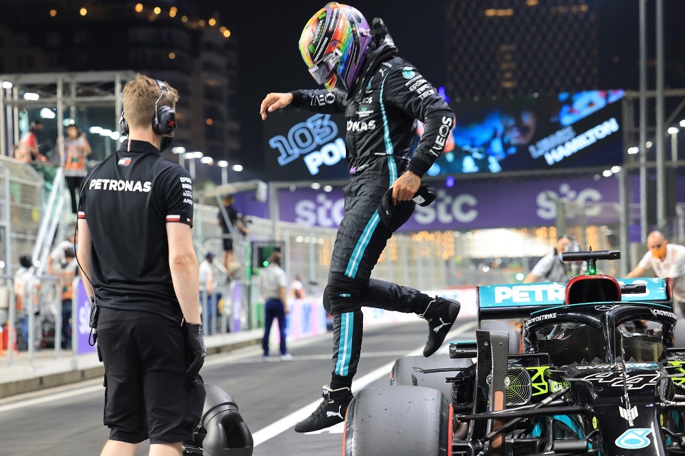 Seven-time Formula 1 world champion Lewis Hamilton at the Saudi Arabian Grand Prix, one of many sporting events hosted in the Kingdom as part of its Vision 2030 plans. (AFP)