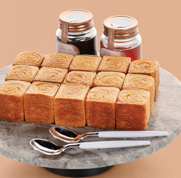 One of the shop’s most sought-after items is the cube croissant, which comes in a breakfast box of two sizes: One box offers 15 cubes and the other 24. Breakfast boxes come with two little jars of honey and strawberry jam to drizzle over the croissants.