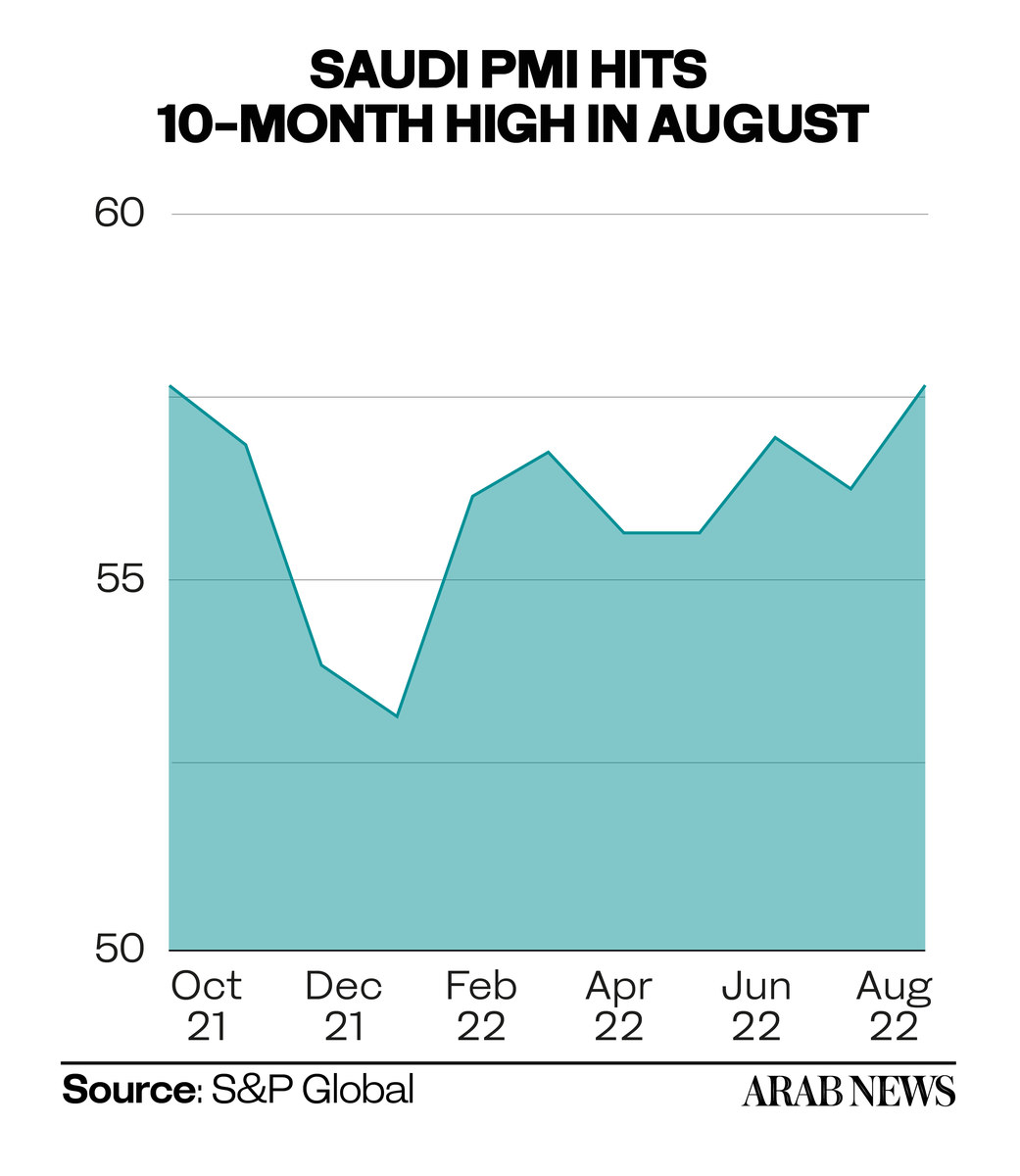 The Kingdom’s PMI stood at 57.7 in August, up from 56.3 in July and the highest since October 2021.