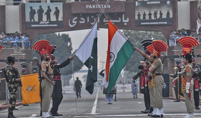 Indian Border Security Force (BSF) personnel and Pakistani Rangers (in black) lower their respective flags during the daily beating of the retreat ceremony at the India-Pakistan Wagah Border Post, about 35 km from Amritsar on November 15, 2021. (AFP/File)
