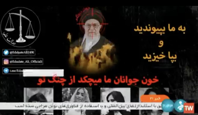 The hack interrupted footage of Khamenei meeting state officials and was claimed by the Edalat-e Ali (Ali’s Justice) hacktivist group, which added a slogan on the top right-hand corner of the screen: “Join us and rise up.”