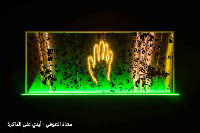 Al-Shashai’s piece, “Amenin,” the Arabic word for “secure,” features LED light mounted on canvas and speaks to the artist’s personal vision for the country’s future, one that embraces inclusivity and community participation. For the initiative, the artist collaborated with the International Rehabilitation Team, which provides daycare services to the severely disabled.