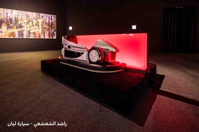His second work, “Layan’s Vehicle,” a mixed media installation of a cleaved bumper car with a vibrant pink light attached, was inspired by an encounter with a young girl named Layan during the workshops. Struck by the child’s lighthearted spirit despite her physical limitations, Al-Shashai created the work as a tribute to her and other individuals who remain resilient in the face of adversity.