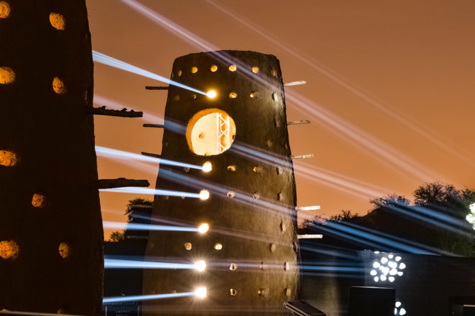 Another work on display at Wadi Hanifah is Saudi multimedia artist Ahaad Alamoudi’s “Ghosts of Today and Tomorrow,” a performative installation that considers the role of light as a natural carrier of information. It is comprised of two ancient pigeon towers, alluding to the historical use of pigeons as message bearers, and a singer who performs a mawwal, a type of traditional Arab song, while light shines out from the openings in each tower.
