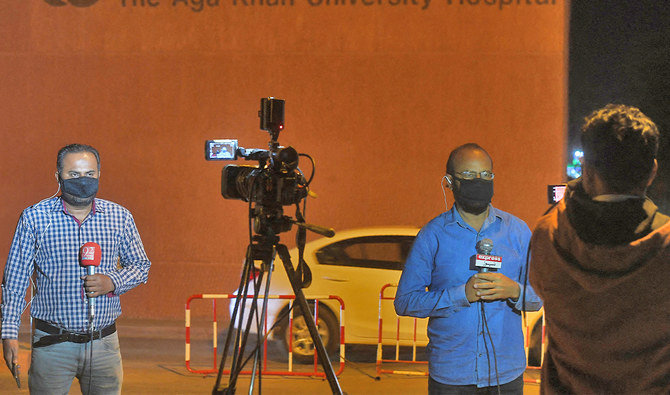 Pakistani journalists report from outside the hospital in Karachi, Pakistan, on February 26, 2020. (AFP/File)